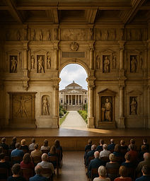 Perspectiva ilusionista: Utilizamos los elementos característicos propios de la obra, para llevar a escena el lenguaje Palladiano a partir de la disposición simbólica del espacio y lo que se aprecia en ellos.